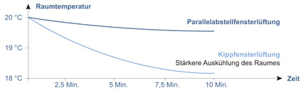 Beim herkömmlichen Lüften mit gekipptem Fenster (Außentemperatur 0° C) kühlt die Raumluft bereits nach 10 Minuten um ca. 2° C herunter, bei parallel gestelltem Fenster nur um 0,5° C